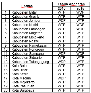Dari LHP yang diserahkan pada Rabu, 31 Mei 2017 di Ruang Auditorium Kantor BPK Perwakilan Provinsi Jawa Timur , 12 pemerintah daerah berhasil mempertahankan Opini Wajar Tanpa Pengecualian (WTP), 4 pemerintah daerah berhasil meningkatkan opini dari WDP menjadi WTP, 1 pemerintah daerah tetap memperoleh opini WDP, dan 3 pemerintah daerah mengalami penurunan opini dari sebelumnya WTP menjadi WDP. Rincian opini BPK atas laporan keuangan TA 2016 kepada 20 pemerintah daerah tersebut adalah sebagai berikut: