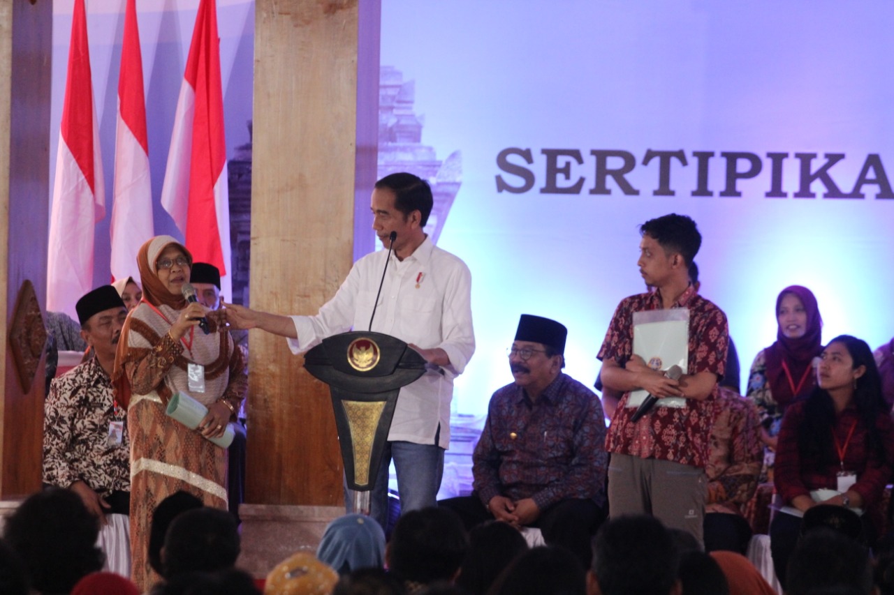 Jokowi juga menyampaikan, dulu sertifikat yang diberikan antara 500 sampai dengan 600 ribu sertifikat. Padahal jumlah sertifikat di Indonesia sekitar 126 juta. Sampai Tahun 2015 yang sudah diberikan sekitar 64 juta sertifikat. 80 sertifikat belum diberikan.