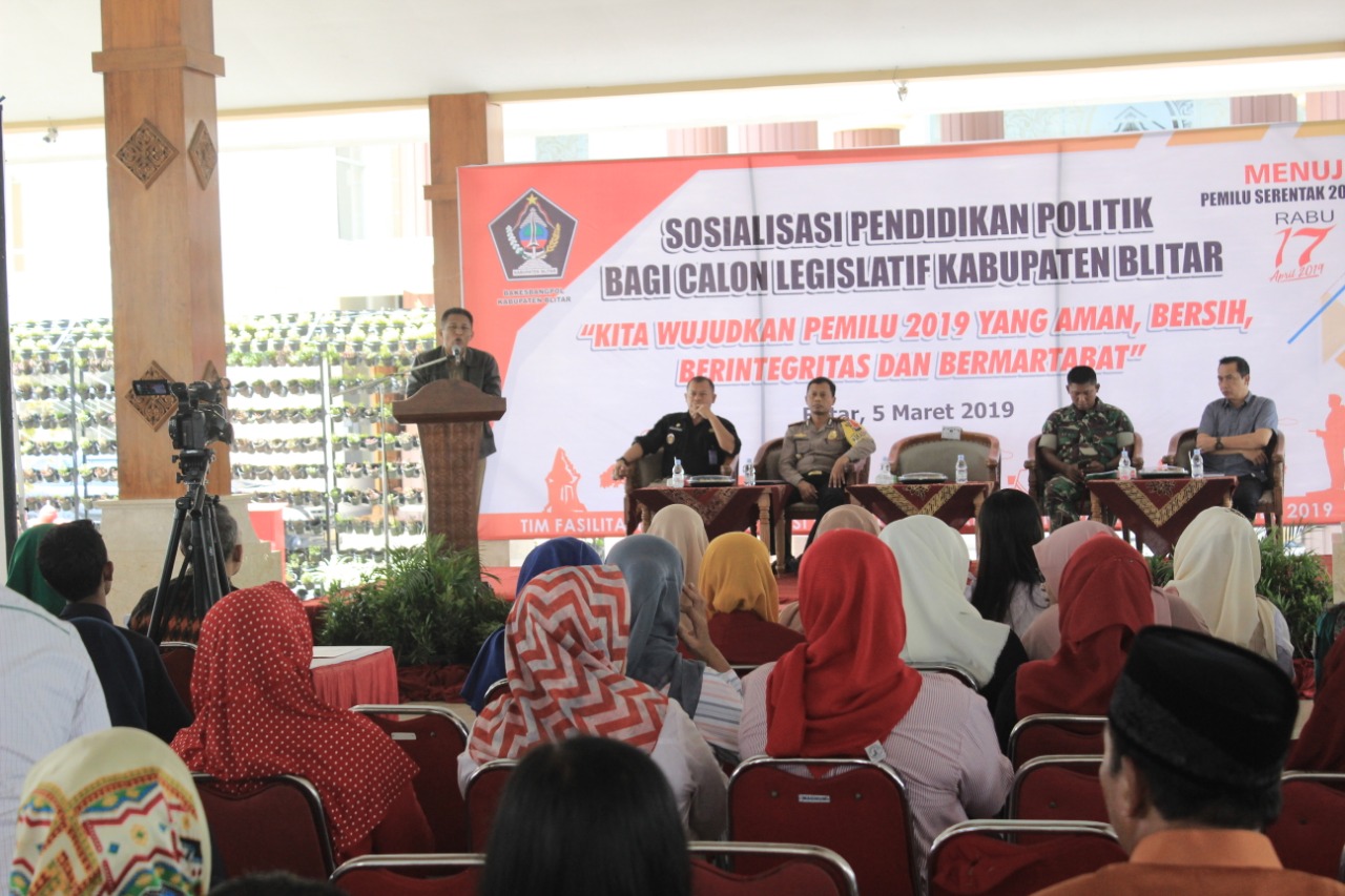 BLITARKAB. Menuju Pemilu serentak 2019, Badan Kesatuan Bangsa dan Politik (Bakesbangpol) Kabupaten Blitar kembali menggelar sosialisasi pendidikan politik kepada calon legislatif Kabupaten Blitar dengan mengusung tema ‘Kita Wujudkan Pemilu 2019 dengan Aman, Bersih, Berintegritas dan Bermartabat’ , Selasa (05/03/2019) di Pendopo Sasana Adhi Praja. Acara tersebut dibuka oleh Wakil Bupati Blitar Marhaenis UW.
