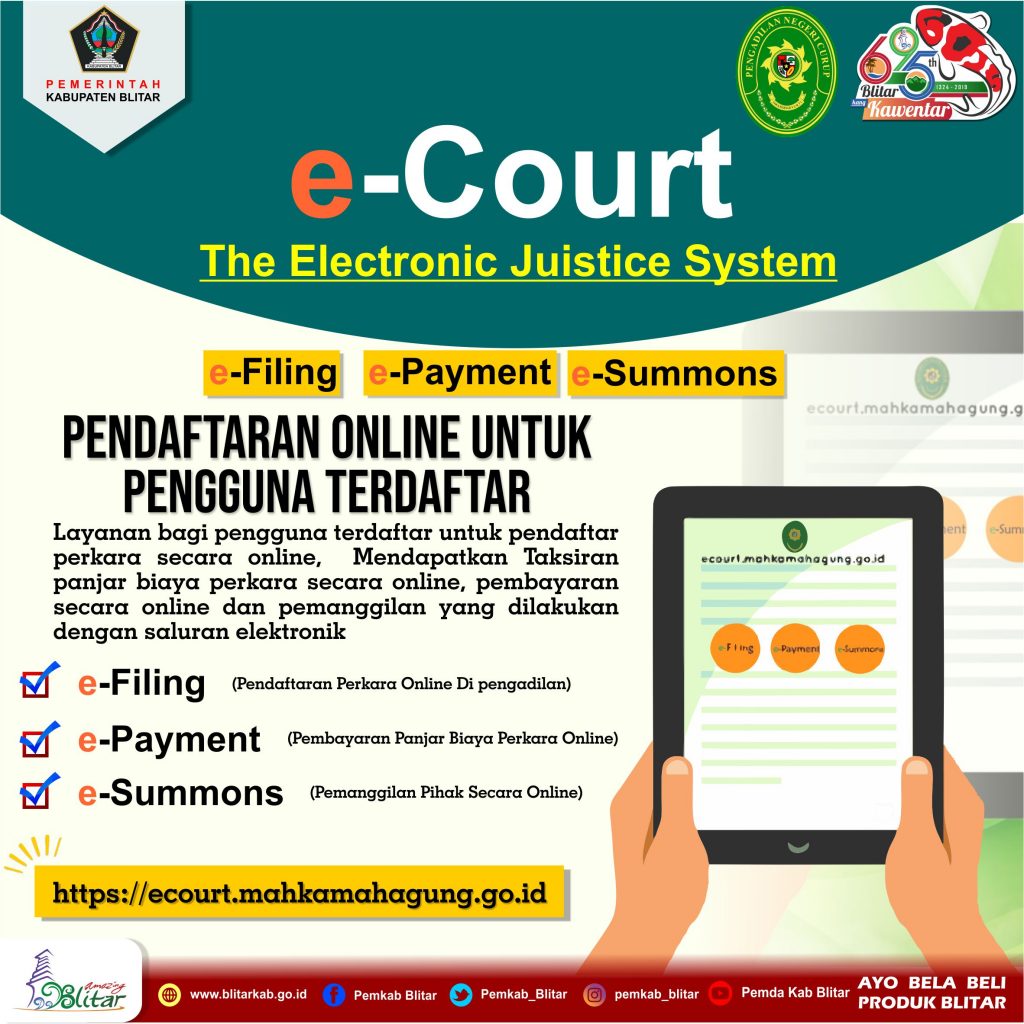 e-court untuk layanan bagi Pengguna Terdaftar untuk Pendaftaran Perkara Secara Online, Mendapatkan Taksiran Panjar Biaya Perkara secara online, Pembayaran secara online dan Pemanggilan yang dilakukan dengan saluran elektronik.