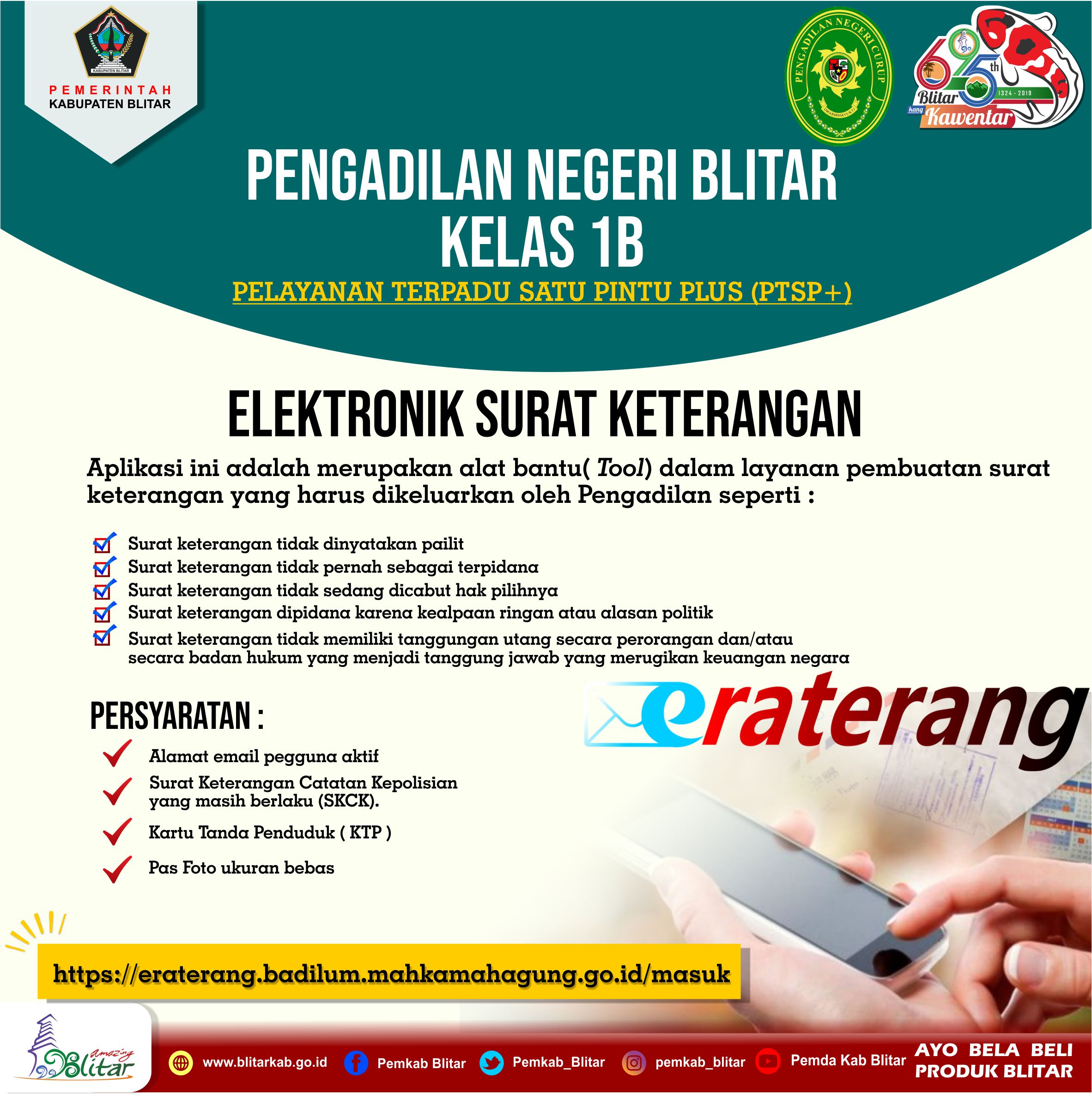 Pengadilan Negeri Blitar telah memiliki aplikasi Elektronik Surat Keterangan (ERATERANG) yang memudahkan orang untuk membuat surat keterangan yang harus dikeluarkan oleh Pengadilan seperti: