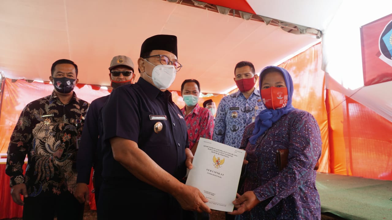 BLITAR KAB – Bupati Blitar Drs. H. Rijanto, MM menyerahkan 290 sertipikat program PTSL (Pendaftaran Tanah Sistematis Lengkap) kepada masyarakat Desa Tambakan, Kecamatan Gandusari, Kamis (17/9/2020).