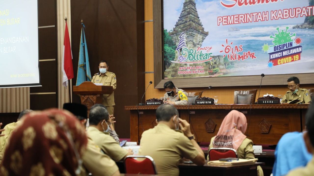 BLITAR KAB – Pemerintah Kabupaten Blitar kembali menggelar rapat koordinasi bersama Tim Gugus Tugas Percepatan Penanganan Covid-19 Provinsi Jawa Timur di Kantor Bupati Blitar, Selasa (26/10/2020).