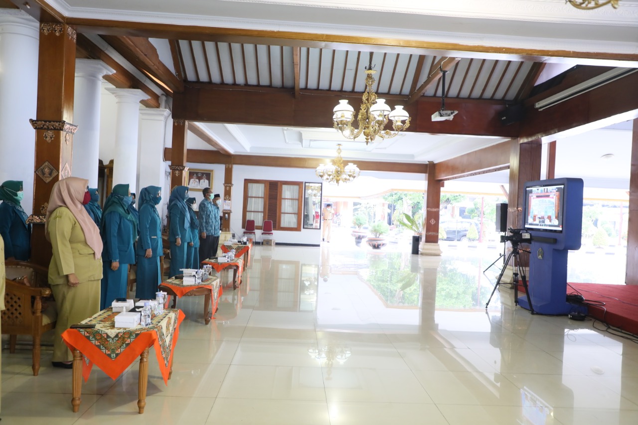 BLITAR KAB – Pjs Ketua Tim Penggerak Pemberdayaan Kesejahteraan Keluarga (PKK) Kabupaten Blitar Ny Wilis Budi Santosa mengikuti pencanangan monitor terpadu kesatuan gerak PKK Bangga Kencana Kesehatan Tahun 2020 di Pendopo Ronggo Hadi Negoro, Selasa, (24/11/2020) secara virtual.