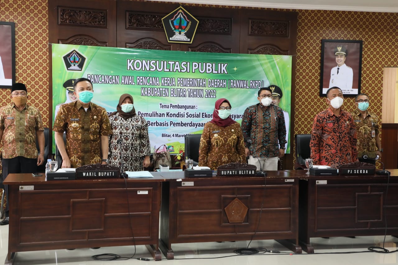 BLITAR KAB – Bupati Blitar Hj. Rini Syarifah dan Wakil Bupati Blitar H. Rahmat Santoso, S.H., MH didampingi Asisten dan Kepala Organisasi Perangkat Daerah (OPD) mengikuti rapat koordinasi terkait Konsultasi Publik Rencana Awal Kerja Pemerintah Daerah (Renwal RKPD) Tahun 2022 yang diselenggarakan di Ruang Transit Kantor Kabupaten Blitar, Kamis (04/03/2021).