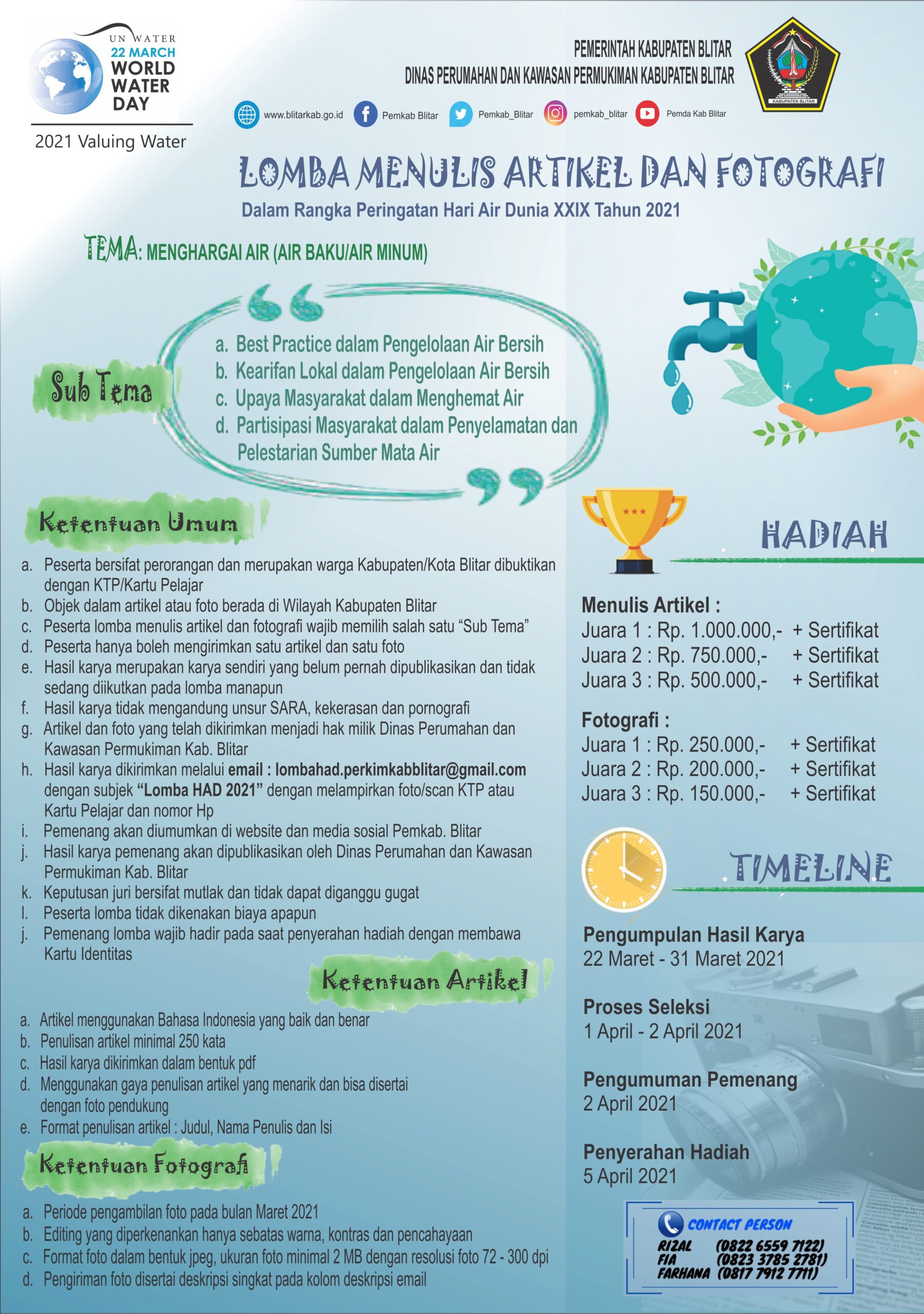 Dalam rangka memperingati Hari Air Dunia 2021, Dinas Perumahan dan Kawasan Permukiman Kabupaten Blitar mengadakan āLomba Menulis Artikel dan Fotografiā dengan Tema āMenghargai Airā. Ditunggu ide-ide brilian kalian semua yah, agar kedepan menjadi input yang baik untuk pengelolaan air baku/ air bersih serta memberikan pesan akan pentingnya menghargai air.