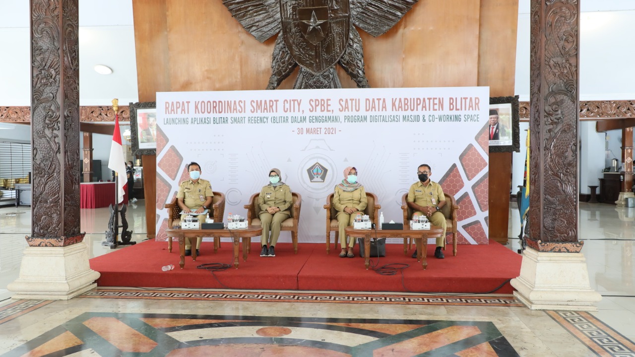 BLITAR KAB – Pemerintah melalui Dinas Kominfo Kabupaten Blitar menggelar Rapat Koordinasi Smart City, SPBE Satu Data Kabupaten Blitar serta Launching Aplikasi Blitar Smart Regency (Blitar Dalam Genggaman), Program Digitalisasi Masjid dan Co-Working Space yang diselenggarakan di Pendopo Ronggo Hadinegoro, Selasa (30/03/2021).