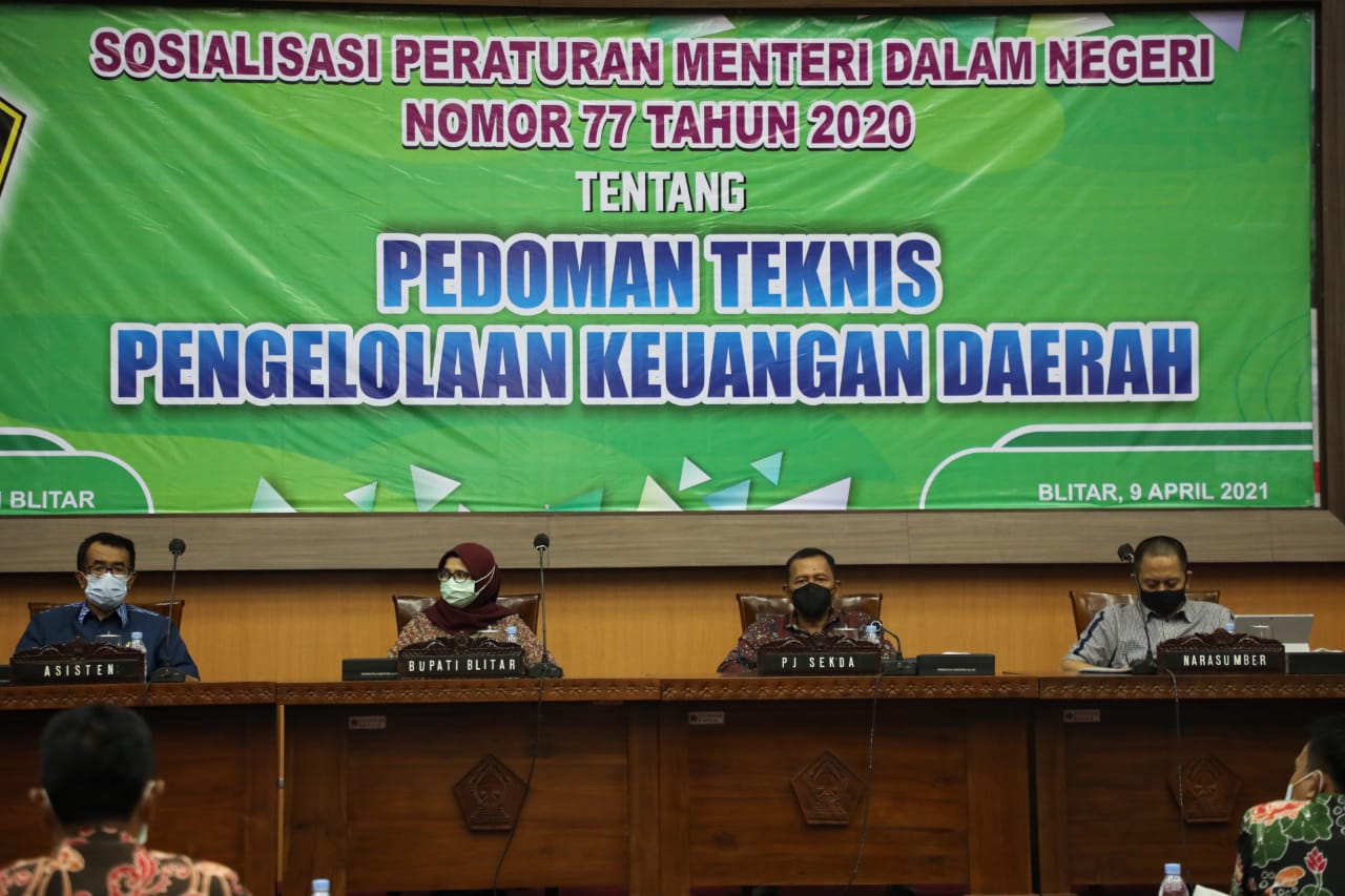 BLITAR KAB – Bupati Blitar Rini Syarifah secara resmi membuka sosialisasi Peraturan Menteri Dalam Negeri Nomor 77 Tahun 2020 terkait dengan pedoman teknis pengelolaan keuangan daerah tahun 2021, Jumat (9/4/2021).