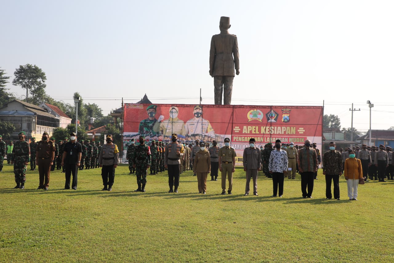 BLITAR KAB – Pemerintah Kabupaten Blitar menggelar Apel Kesiapan Pengamanan Larangan Mudik Hari Raya Idul Fitri 1442 H/2021 M bertempat di alun-alun Kanigoro, Senin, (26/04/2021).