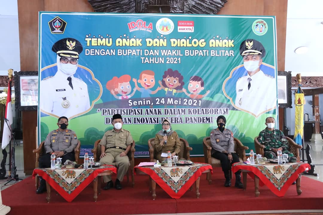 BLITAR KAB – Bupati Blitar Rini Syarifah menggelar dialog secara virtual dan tatap muka dengan perwakilan anak Se-Kabupaten Blitar bertempat di Pendopo RHN, Senin (24/5/2021).