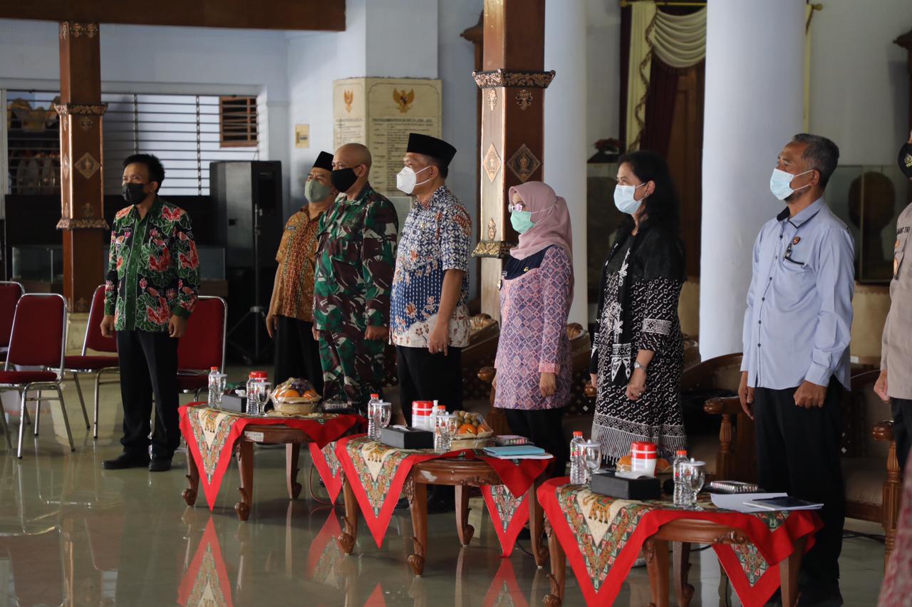 BLITAR KAB- Bupati Blitar H. Rini Syarifah didampingi Forkopimda, Asisten I beserta Kepala OPD mengikuti acara Focus Group Discussion (FGD) terkait Sosialisasi Kelembagaan Perlindungan dan Pemberdayaan Perempuan dan Anak dalam Konflik Sosial (P3AKS) yang diselenggarakan di Pendopo Ronggo Hadinegoro, Jum’at (28/5/2021).