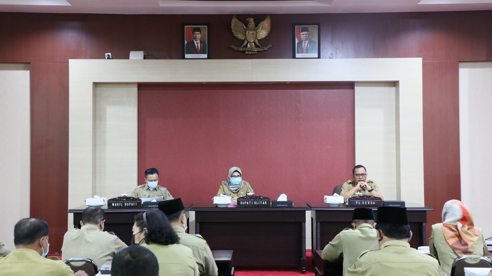 BLITAR KAB – Bupati Blitar Rini Syarifah bersama Wakil Bupati H. Rahmat Santoso, SH.,MH. memimpin rapat staf percepatan penyerapan APBD diikuti oleh seluruh Kepala OPD Pemerintah Kabupaten Blitar, bertempat di Ruang Perdana, Senin (31/5/2021).