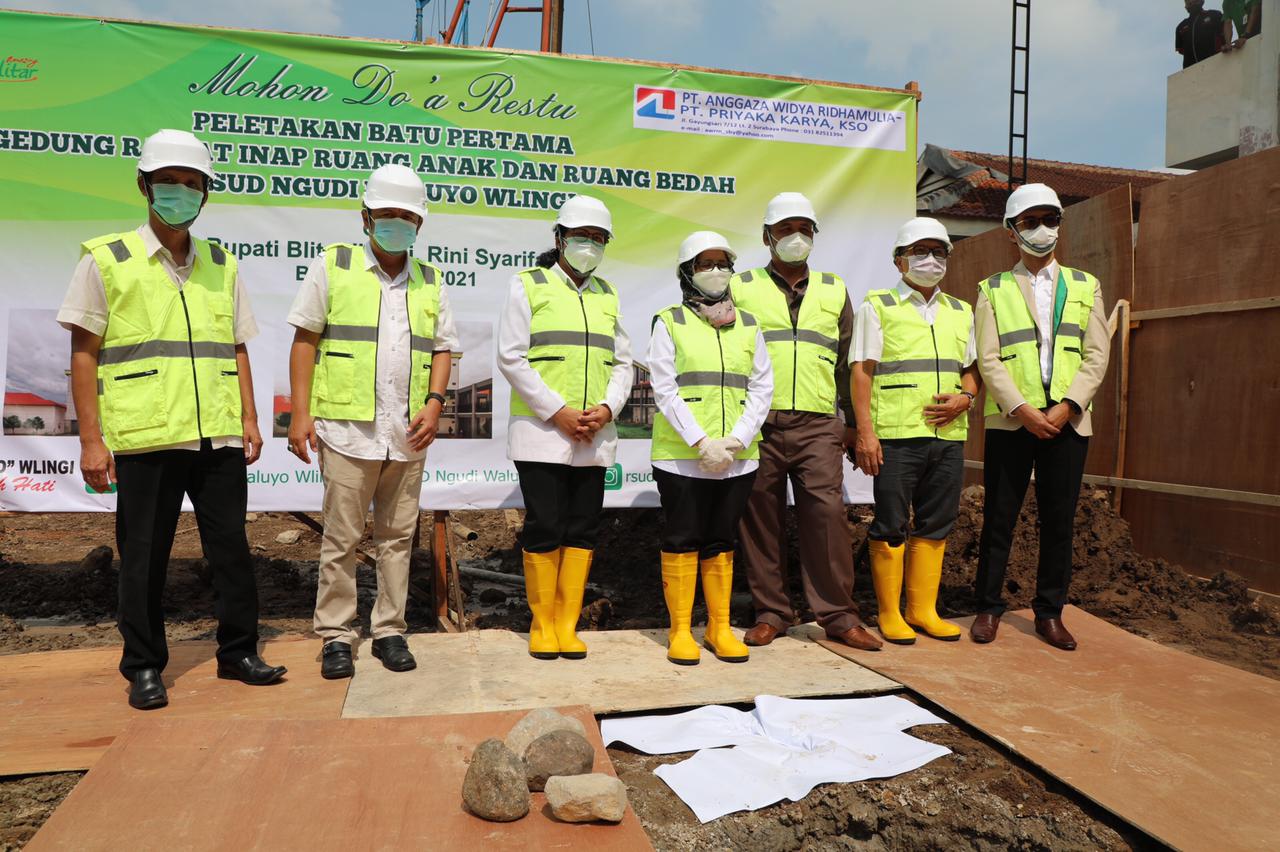 BLITAR KAB – Bupati Blitar Rini Syarifah meletakkan batu pertama pembangunan gedung rawat inap anak dan bedah serta launching E-Blud dan E-Rekam Medis RSUD Ngudi Waluyo Wlingi, Rabu(23/6/2021).
