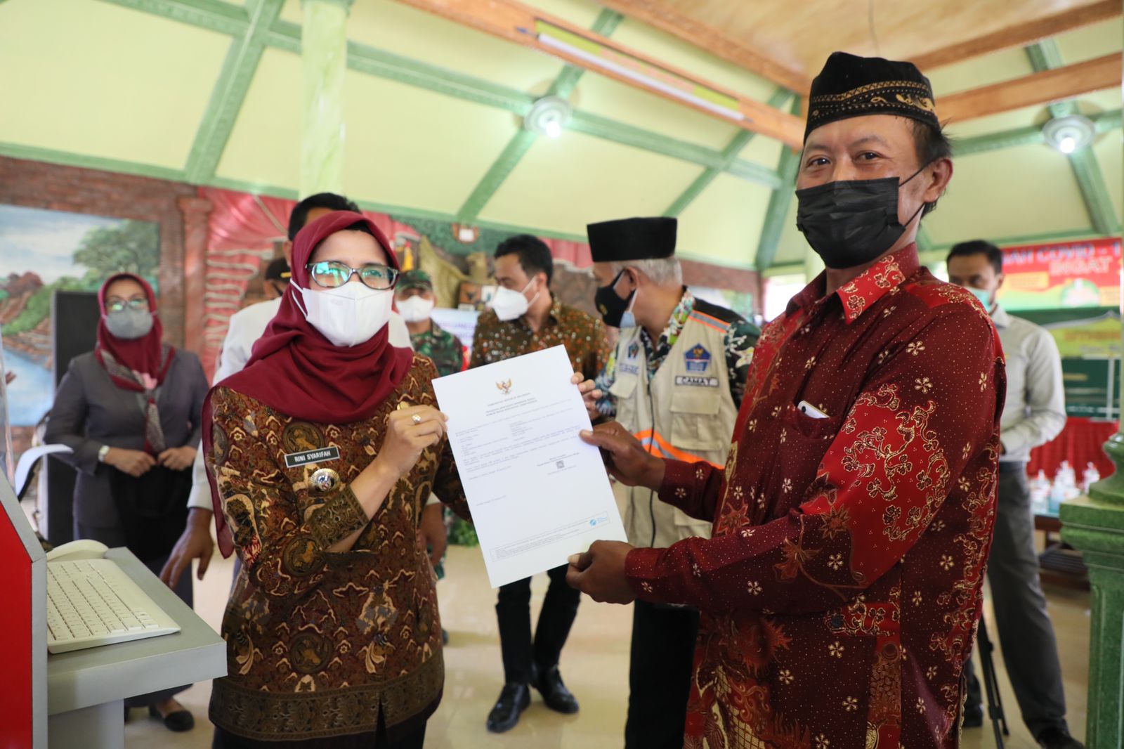 BLITAR KAB – Bupati Blitar Rini Syarifah launching layanan Online Single Submission di desa secara online (Loss Dol) dan kesiapan DPMPTSP Kabupaten Blitar dalam implementasi OSS RBA bertempat di Kantor Desa Binangun, Rabu (26/08/2021).