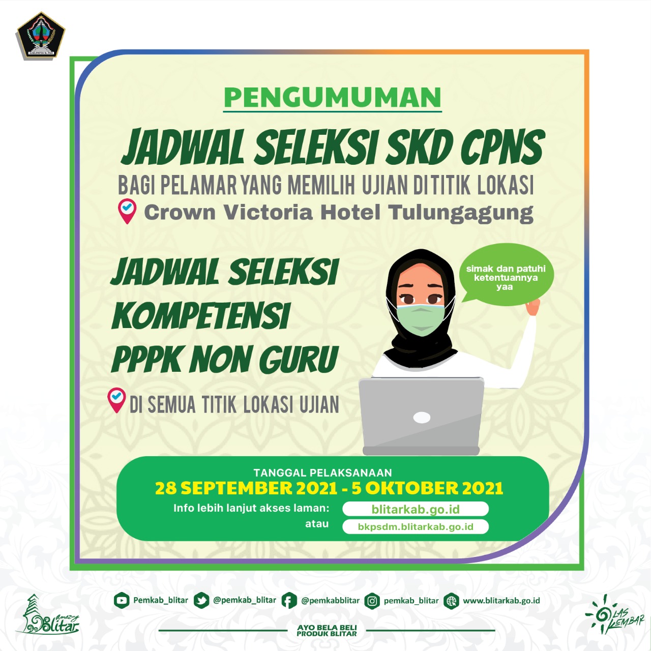 JADWAL SELEKSI KOMPETENSI DASAR (SKD) CPNS YANG MEMILIH TITIK LOKASI UJIAN DI CROWN VICTORIA HOTEL TULUNGAGUNG SERTA JADWAL SELEKSI KOMPETENSI PPPK NON GURU DI SEMUA TITIK LOKASI UJIAN