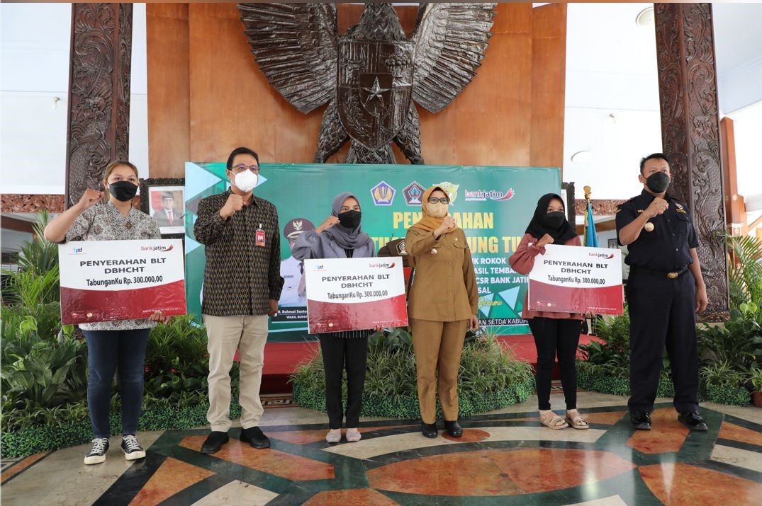 PEMKAB BLITAR – Bupati Blitar, Rini Syarifah bersama dengan Pimpinan Bank Jatim Cabang Blitar dan Kepala Kantor Pengawasan dan Pelayanan Bea dan Cukai Tipe Madya Pabean C Blitar melakukan Penyaluran BLT DBHCHT untuk Buruh Pabrik Rokok dan Penyerahan CSR Bank Jatim Cabang Blitar untuk Sunatan Massal. Kegiatan ini dilaksanakan di Pendopo RHN pada Senin (06/12/2021).