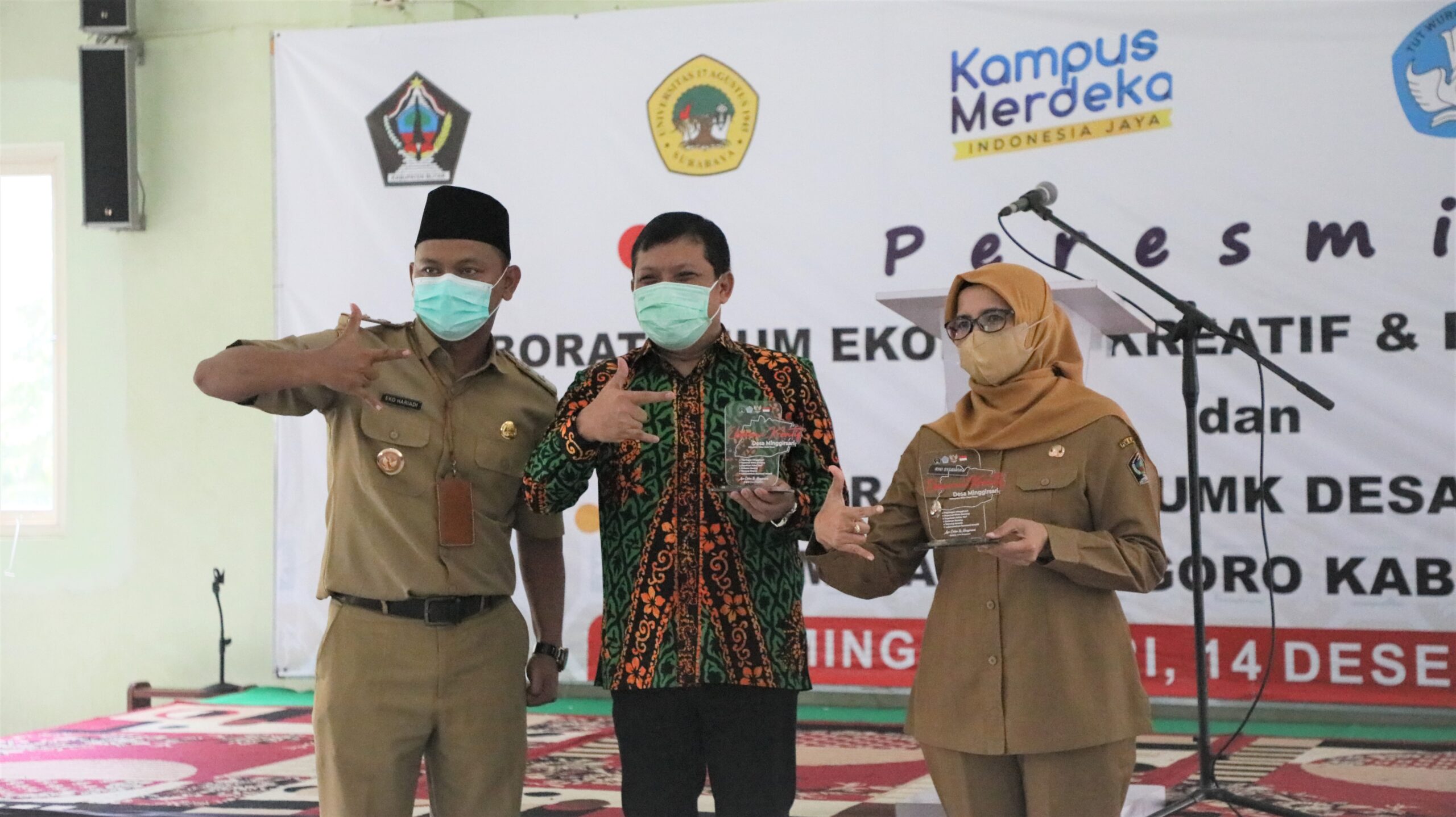 BLITAR KAB – Bupati Blitar Rini Syarifah didampingi Rektor Universitas 17 Agustus 1945 (UNTAG) dan Kepala Desa Minggirsari meresmikan Pusat Studi Ekonomi Kreatif dan Pariwisata sekaligus menutup acara Matching Fund 2021 di Desa Minggirsari Kecamatan Kanigoro, Selasa (14/12/2021) di Gedung Graha NU.