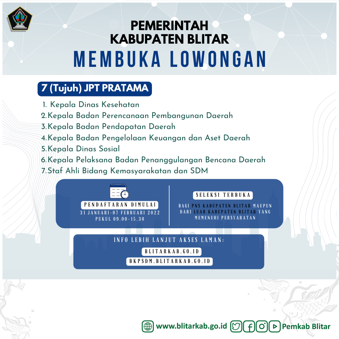 Dalam rangka pengisian secara terbuka JPTP di Lingkungan Pemerintah Kabupaten Blitar Tahun 2022 sesuai UU Nomor 5 Tahun 2014 tentang ASN, PP Nomor 11 Tahun 2017 tentang Manajemen PNS sebagaimana telah diubah dengan PP Nomor 17 Tahun 2020 dan Permenpan RB Nomor 15 Tahun 2019 tentang Pengisian JPT secara terbuka dan kompetetitif di lingkungan Instansi Pemerintah serta SE Menpan RB Nomor 52 tahun 2020 tentang Pelaksanaan Pengisian JPT secara Terbuka dan Kompetitif di Lingkungan Instansi Pemerintah dalam Kondisi Covid-19, dengan ini kami Panitia Seleksi memberikan kesempatan kepada PNS yang memenuhi persyaratan untuk mendaftarkan diri sebagai peserta dengan ketentuan sebagai berikut: