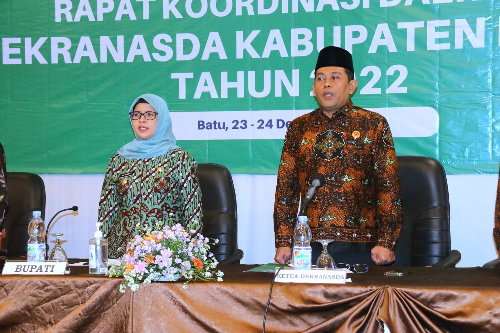 BLITAR KAB – Bupati Blitar Hj. Rini Syarifah bersama Ketua Dekranasda Kabupaten Blitar H. Zaenal Arifin menghadiri Rapat Koordinasi Daerah Dekranasda Kabupaten Blitar yang diselenggarakan di Hotel Royal Orchid Batu, pada hari Sabtu 23 Desember 2022, yang dihadiri Ketua Dekranasda Prov. Jatim dan OPD Pemerintah Kabupaten Blitar.