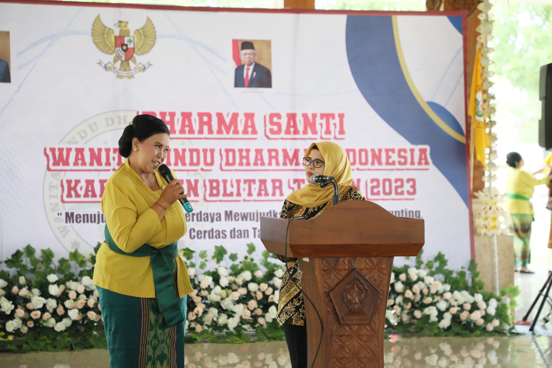 BLITAR KAB – Bupati Blitar Hj. Rini Syarifah menghadiri kegiatan Perayaan Dharma Santi Wanita Hindu Dharma Indonesia (WHDI) Kabupaten Blitar Tahun 2023 di Pendopo Sasana Adhi Praja, Kamis (2/3/2023).