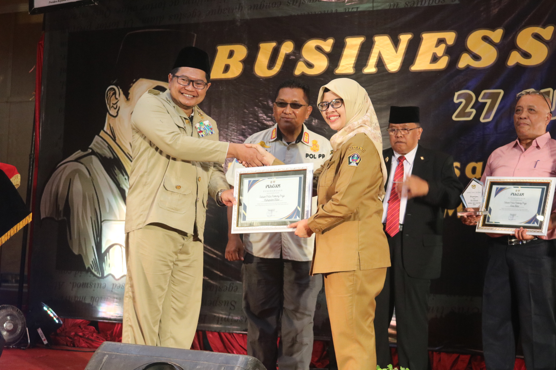 PEMKAB BLITAR – Bupati Blitar, Rini Syarifah didampingi Kepala Satpol PP Kabupaten Blitar menerima penghargaan dalam Bussiness and Custom Award kategori Penindakan Peredaran Rokok Ilegal terbanyak dari Kantor Pelayanan Bea Cukai Blitar. Kegiatan ini dilaksanakan pada Selasa (27/6) di hall Grand Mansion Blitar.