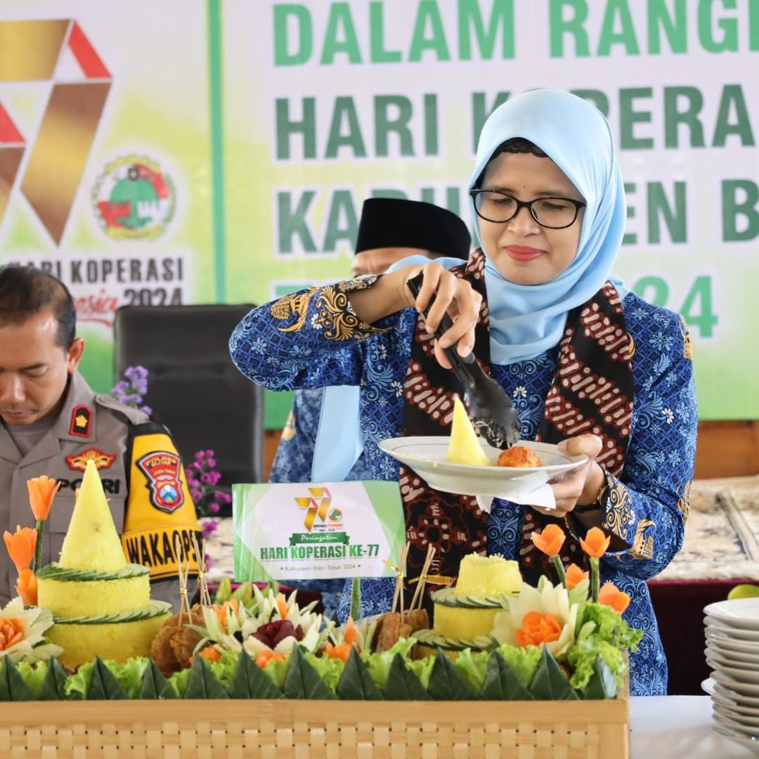 Mak Rini sapaan akrab Bupati Blitar membacakan sambutan dari Menteri Koperasi dan Usaha Kecil dan Menengah Republik Indonesia Teten Masduki yang isinya Pada peringatan 77 Tahun Hari Koperasi kali ini, menjadi penting untuk merefleksikan bagaimana agar peran koperasi di Tanah Air semakin strategis dalam menjawab tantangan krisis dan ketidakpastian tersebut, khususnya untuk mempercepat ikhtiar kebangsaan keluar dari middle income trap.