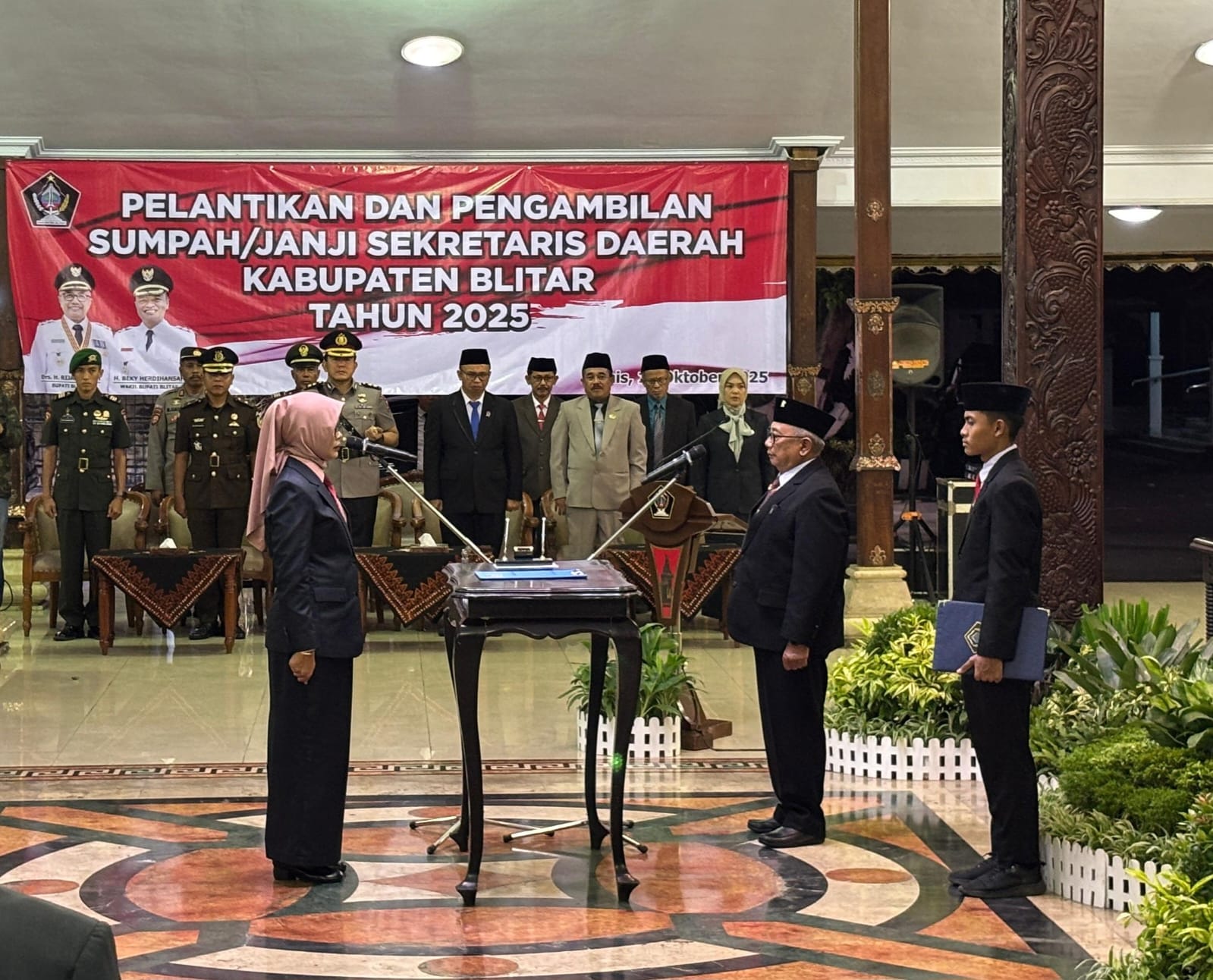 Pemkab Blitar – Pemerintah Kabupaten Blitar melakukan pelantikan dan pengambilan sumpah jabatan pimpinan tinggi pratama Sekretaris Daerah Kabupaten Blitar. Bupati Blitar Rijanto secara langsung melantik Khusna Lindarti sebagai Sekda Kabupaten Blitar bertempat di Pendopo Ronggo Hadi Negoro, Kamis, 16 Oktober 2025.
