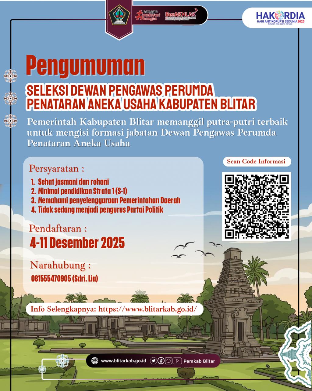 Pemkab Blitar – Sehubungan adanya kekosongan posisi Dewan Pengawas pada salah satu BUMD milik Pemerintah Kabupaten Blitar yaitu Perumda Penataran Aneka Usaha, akan diselenggarakan seleksi untuk posisi Dewan Pengawas pada Perusahaan dimaksud. Cek info selengkapnya melalui link di bawah ini :